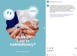 Tu najważniejsze są empatia, spokój i zaufanie. Dobrze działają posty edukacyjne, cytaty z wartościowym komentarzem, animacje oraz materiały wideo, które oswajają lęk i budują więź jeszcze przed pierwszą wizytą.